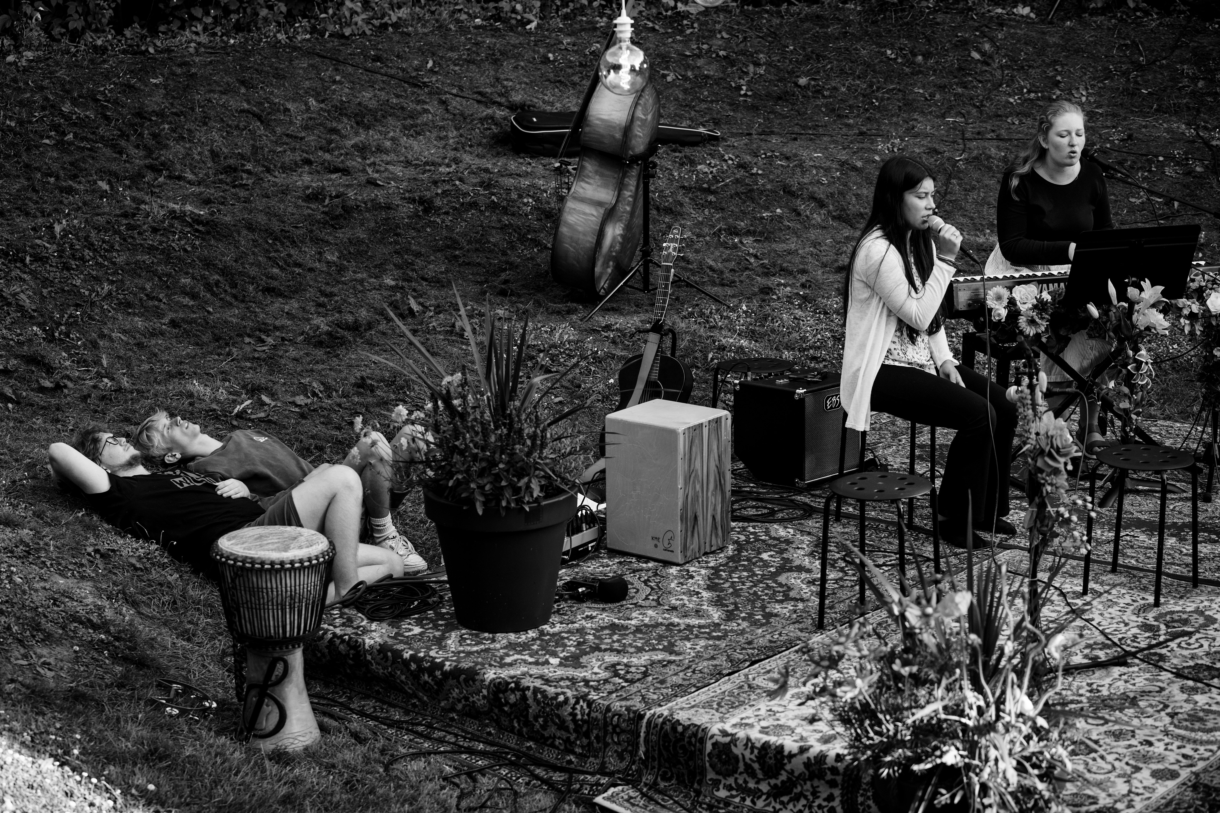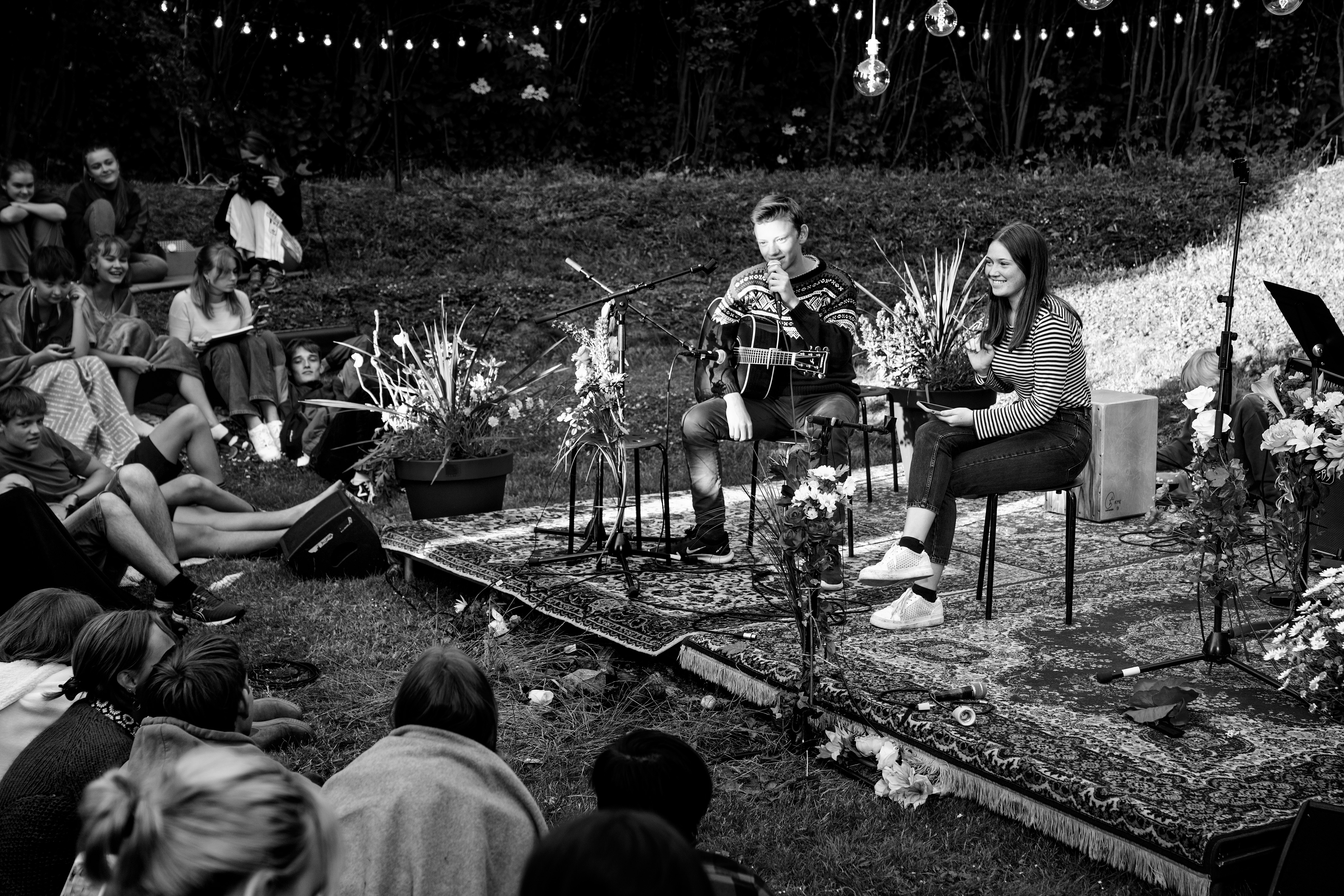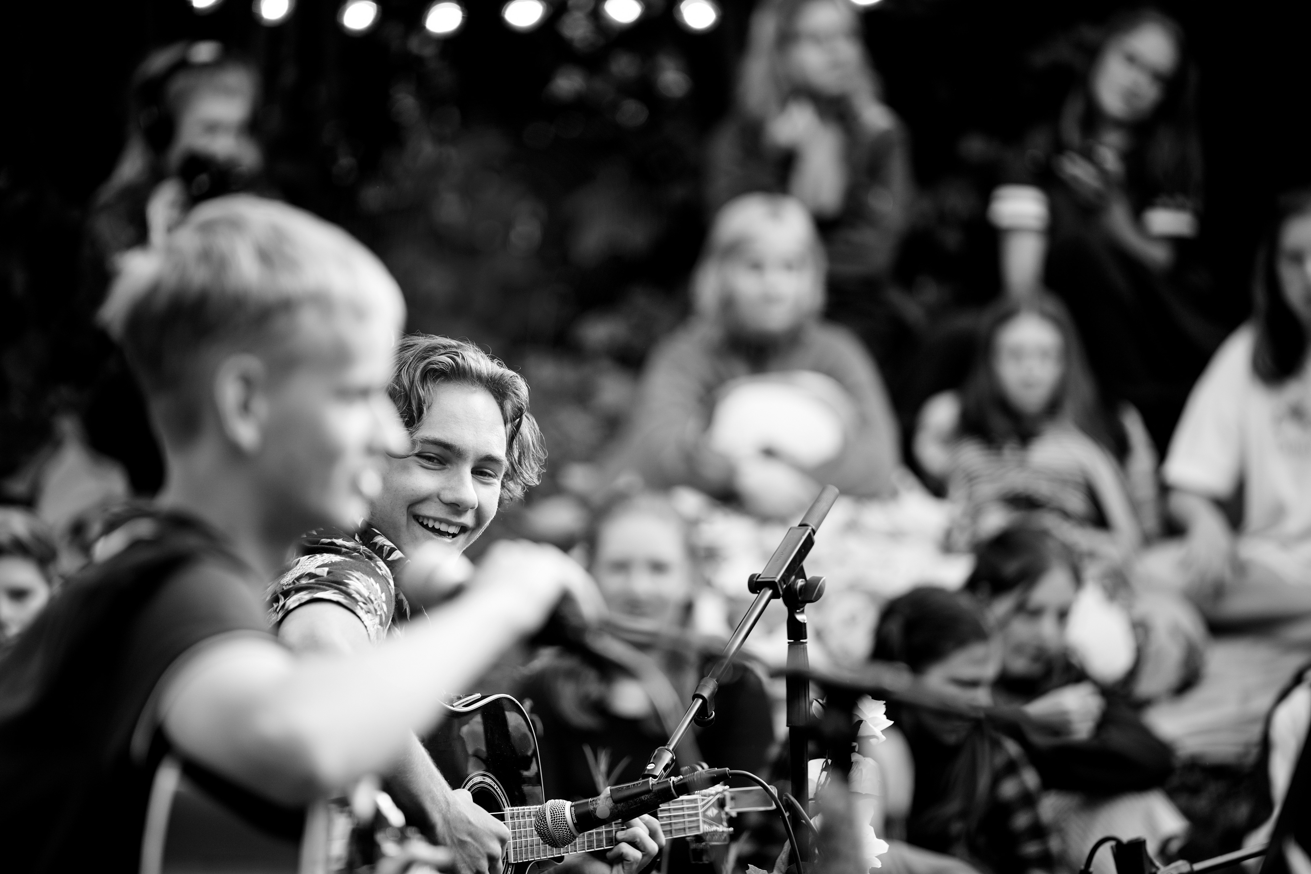 Ca en gang om måneden arrangerer eleverne det vi kalder "Åben scene." Her kan du tilmelde dig med dit band, synge den sang du har arbejdet med til sangskrivning, optræde med dine roomies i et band, hvor ingen spiller på deres hovedinstrument eller hvad du nu har lyst til. Der er ingen grænser, kun din fantasi - det eneste vi ved med sikkerhed er at der altid er 100 skrigende fans til din guitarsolo, 50 "lightere" tændt til din smukke ballade og larmende bifald, når du stiller dig op og optræder med "noget der ikke er helt færdigt endnu, så jeg er nok lidt nervøs". Nederst på siden kan du se billeder fra årgang 19/20's sidste Åbne scene, der ikke som normalt foregik i lille sal, men under Åben himmel ved vores store bålplads.